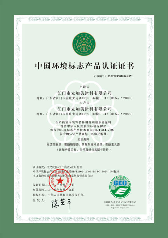 中国环境标志产品认证证书
